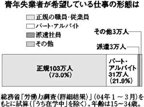 中塚亮区議が本会議で青年の雇用確保問題を追及 今年7月の総務庁の調べでは、完全失業者数318万人に対し15歳〜24歳が62万人、24歳〜34歳が92万人と、完全失業者数の48%が若年層で占められています。 青年の雇用状況は「失業者の2人に1人が若者」という前代未聞の深刻な事態です。 ニート52万人・・・・「働く気のない青年」 区長・・「先日公表されました労働経済白書におきまして、働く意欲を持たない「ニート」と呼ばれる若年無業者の問題が多くクローズアップされているように、若者の雇用問題の背景には、社会、システム上の問題のみならず、若者の意識の多様化など様々な要因が複雑に絡んでいる事は正規の事実でございます。」