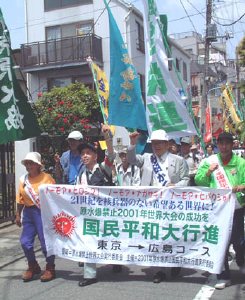 21世紀を核兵器のない希望ある世界に 二十一世紀を核兵器のない希望ある世界にーと、二〇〇一年原水爆禁止国民平和大行進が六日、広島に向けて江東区夢の島を出発しました。七日は港区から品川区内を通過して神奈川県に入りました。日本共産党からは秋田かくお都議会議員と区議団から私(みやざき)も参加しました。