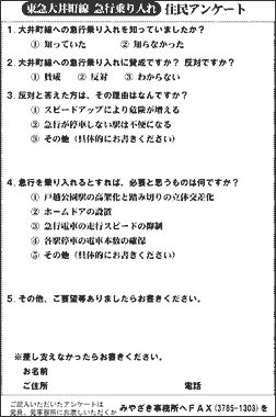 東急線沿線は人口増加が見込まれています。現在乗車率195%の「溝の口〜渋谷」間の混雑緩和を目的に、「溝の口〜大井町」間への急行乗り入れにより乗客を大井町線に誘導します。 地元住民からは、「中延や戸越公園など急行が停まらない駅は不便になる」、「踏み切り事故が心配」などの声が寄せられています。ある町会長さんは「戸越公園駅を高架化しなければ急行乗り入れは認めない」と反発しています。 「輸送力アップ」だからと、地元が危険にさらされたり不便を強いられることがあってはなりません。 下記のアンケートにぜひ、ご協力ください。 ご記入いただいたアンケートは党員、党事務所にお渡しいただくか、みやざき事務所へFAX(3785-1303)を |