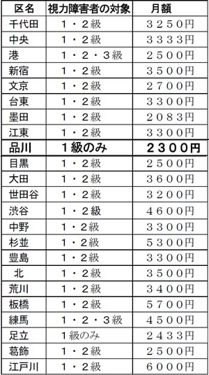 23区中下から2番目 障害者福祉タクシー券 「品川区の福祉は進んでいる」とよく聞きますが、障害者に支給している福祉タクシー券、他区と比べても少なすぎる状況がわかりました。改善して区民の皆さんに喜んでもらえるよう頑張らなくてはいけません。予算委員会で、党議員団が取り上げた内容を紹介します。 あまりにもお粗末23区で下から2番目 障害者から時々「タクシー券の枚数を増やしてもらえないか」という意見を聞きます。 福祉タクシー券とは、『障害のため外出困難な人の社会生活の利便と生活圏の拡大を図るための制度』で、対象は、@身体障害3級以上、A視覚障害1級、B内部障害1級、C愛の手帳2度以上の方。支給金額は月2300円です。 ところが、23区を調査するとあまりにも低すぎ、下から2番目であることがわかりました。多くの区が3000円を越え、江戸川区は6000円です。 せめて3500円に増額を求める 党議員団は、予算委員会で23区の平均(3483円)まで引き上げるよう求めました。区の答弁は「個別給付よりサービス全体の充実を図っていく」といい、さらに金額を引き下げようとしている他区の事を持ち出しました。 タクシー券を利用している方の多くは、「病院に一度いったらなくなってしまうので、後は全部自己負担」といいます。障害者の方たちは、法律が改悪されて受けているサービスの1割負担になるため、経済的な負担がずーんと重くなるので深刻な事態です。 痛みを何も感じない区の冷たい姿勢にあらためて怒りを覚えます。 視力障害2級も対象にせよ